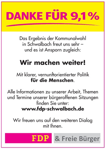 In den kommenden Wochen werden die politischen Weichen für die neue Legislaturperiode gestellt. Wir werden uns konstruktiv in die Gespräche einbringen und uns dafür einsetzen, dass Schwalbach sich finanziell solide, lebenswert und zukunftsfähig aufstellt.